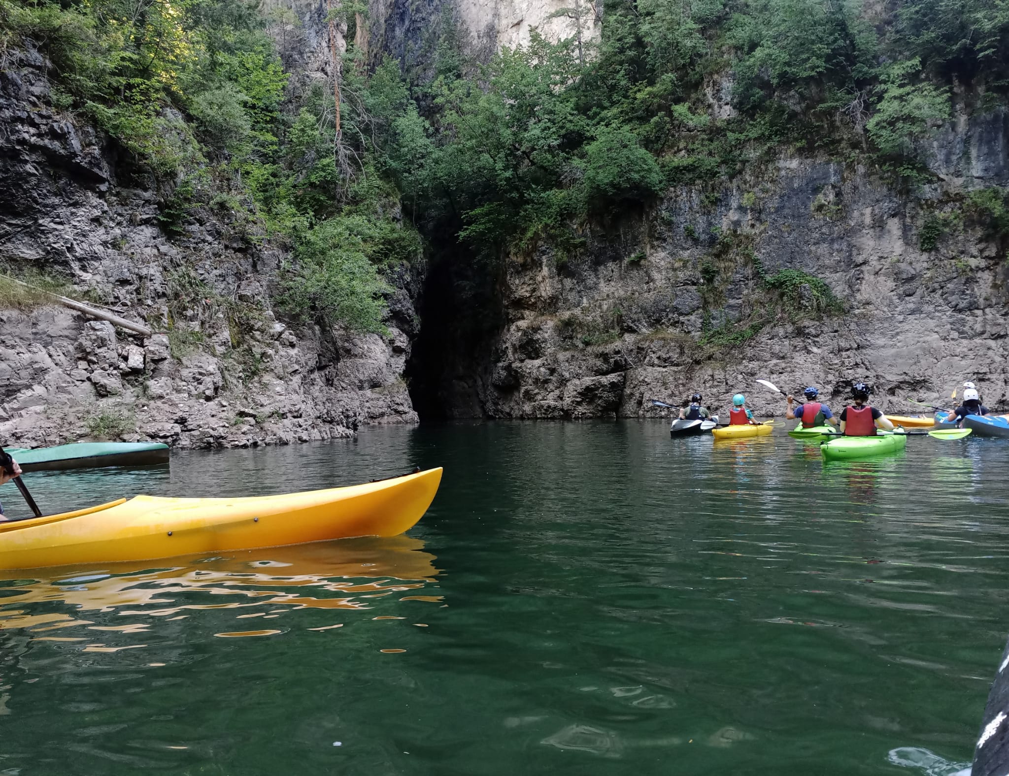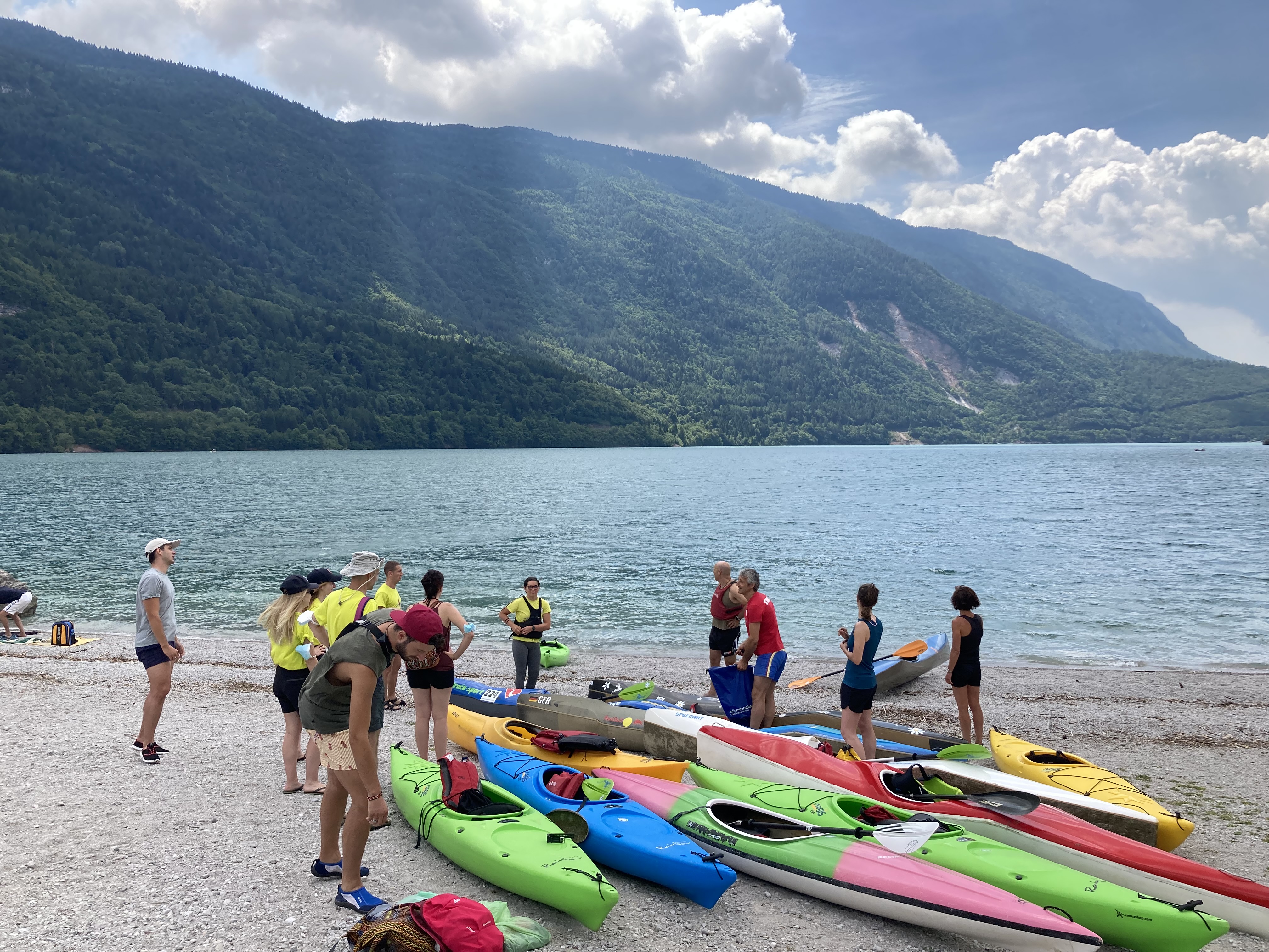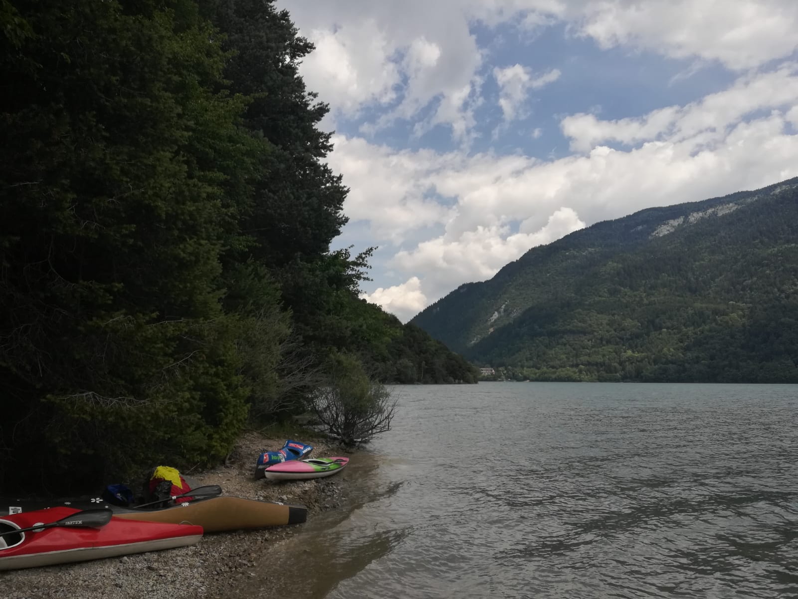 Le previsioni meteo, peraltro, erano a dir poco preoccupanti ma senza un poco di ottimismo non si va da nessuna parte, giusto? E infatti, organizzazione perfetta – dalla scelta della nostra escursione a quella del luogo ove collocare il nostro piccolo accampamento, alla tabella di marcia oraria per l’escursione alle gole adiacenti al lago – umore alto e cordialità da regalare. Da regalare anche a chi, appena arrivato, aveva meno dimestichezza con il gruppo e con il mezzo, e quel mix di esperienza e di sprovvedutezza che ha fatto sì che tutti insieme godessimo di una pagaiata piacevole, immersa in un paesaggio luminoso.